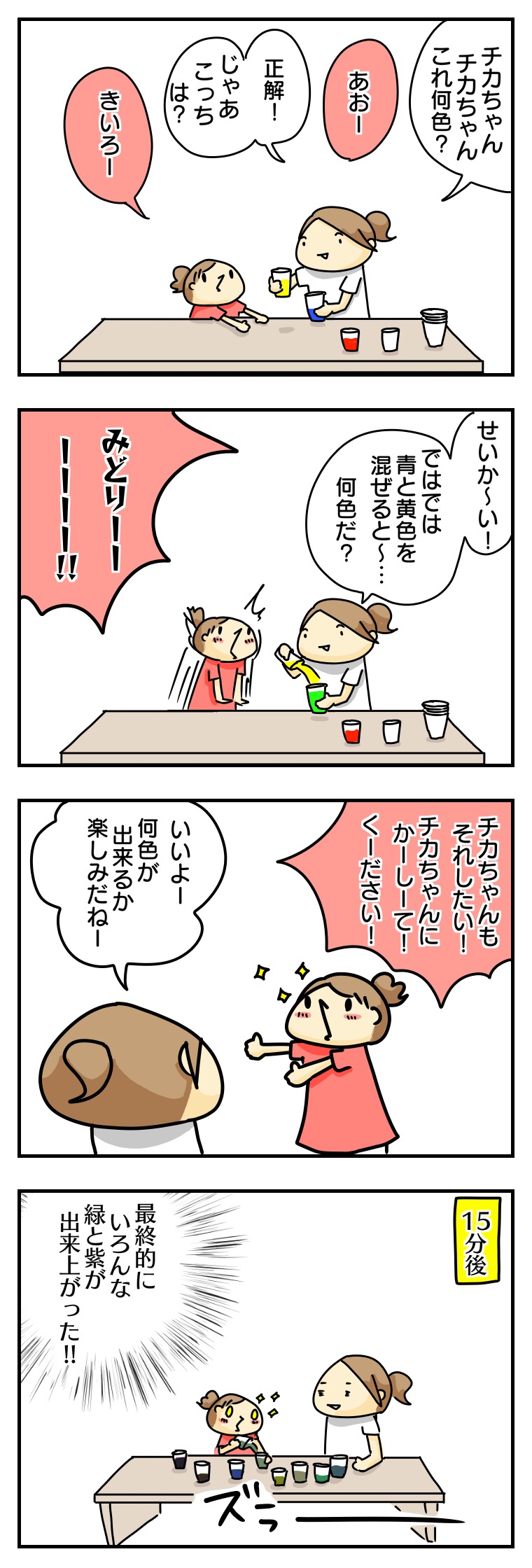 2017年08月08日 床は茶色の水たまり 抹茶色のバリエーションがとても豊。 先日の、“教えて札幌に詳しい人!”へのたくさんのコメントありがとうございます! 教えてもらったお店の名前と特徴を全部書き出してどこに行こうか吟味吟味の日々でした。旅行は行く前のこの時間も楽しみの一つですね。すっかりブログが更新出来ずにいましたがこんな感じでチカは元気です。ランキング参加しています。クリックで応援よろしくお願いします!育児絵日記ランキングへ 「チカ・3歳」カテゴリの最新記事 タグ :#チカ#3歳1ヶ月 < 前の記事次の記事 > コメント コメント一覧 (2) 1. まゆママ 2017年08月09日 00:05 ちか母さん、絵具で色のお勉強ですね(^^) やりたがり2歳児のうちの娘も、喜びそう。だけど、えらいことになるのが目に見えてるので、やりたくない(¬_¬) ちか母さん、えらいですねー。 ちかちゃんの感動ぶり、可愛い💕 この間、市販の小麦粘土で、赤と青を混ぜたら紫になるんだよーとやりましたが、すぐに全色の粘土をこね合わせてしまい、なんとも言えない緑色になっていますʅ(◞‿◟)ʃ 色が変わることより、こねこねしたかったらしい(笑) 2. まーりゃん 2017年08月09日 10:23 絵の具で勉強いいですね! うちはまだ言葉があんまりなのとなんでもぐちゃぐちゃにするのでもう少し先になりそうです 粘土もすぐ混ぜちゃうし… コメントフォーム 名前 コメント 記事の評価 リセット リセット 顔 星 情報を記憶 コメントを投稿する