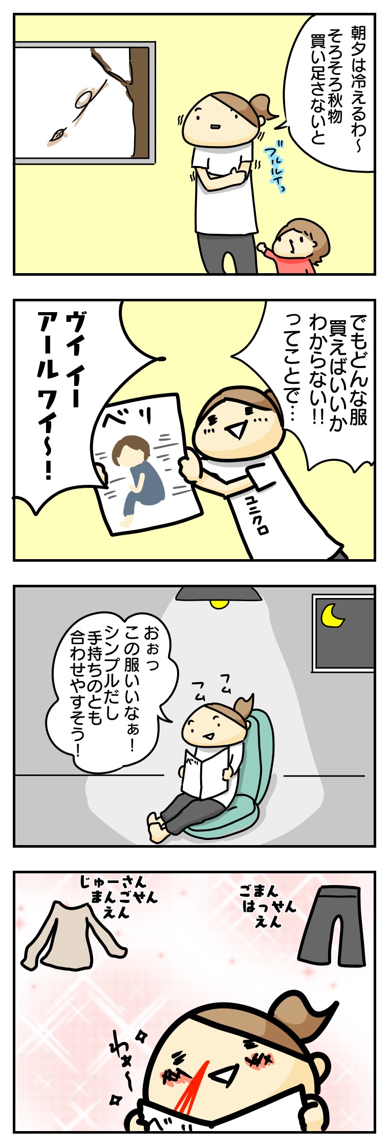 2017年09月09日 全身は20万超えることになる 前に描いた3万の白い服が可愛く見える。鼻血噴出すことも多いのですが、あれからもベリさんを購読しております。掲載されているのと似たような服をゼロひとつ取って2で割ったくらいのお値段で捜し求めています。ランキング参加しています。クリックで応援よろしくお願いします!育児絵日記ランキングへ 「チカ母」カテゴリの最新記事 タグ :#チカ母 < 前の記事次の記事 > コメント コメント一覧 (4) 1. まーりゃん 2017年09月09日 11:01 妊娠中から産後一年は着やすい、動きやすい、汚れていい服が中心になりますもんね そして妊娠前のお洒落な服が入らないというか似合わない 2. かよん 2017年09月09日 11:40 初めてコメントさせていただきます(*´°`*)いつも可愛いチカちゃんとお母さんの記事、楽しく拝見しています。 わかりますー‼︎私も4ヶ月になる男児ママですが、妊娠、出産を経て自分の服や化粧にこだわってられないといいますか…とりあえず、授乳できたらいいや!抱っこしてたら暑いしとか思って、適当な服を着てしまいます。雑誌の中の服に似た、いかに安い服をゲットするか…それが主婦の力の見せどころですよね(笑) 3. りゅんりゅん 2017年09月18日 22:04 はじめまして☆1歳の男の子を育てています。 夫にこのブログを紹介してもらって拝見しています❗チカちゃん可愛いです(*´ω`*) 私は産前の時はヒラヒラフリフリの服でしたが、趣味が変わり今はユニクロ、GU、しまむらです(笑)最近はGUにどっぷりハマっている私です💖 シンプル イズ ベストです(笑) 4. カピバラ 2017年09月21日 20:47 わかります🎵 雑誌やテレビでいいなと思うだけで それを買うことはなく 質は落ちるけど子供に引っ張られたり汚されても怒らずにいれる服になります(笑) GUが神です😍 コメントフォーム 名前 コメント 記事の評価 リセット リセット 顔 星 情報を記憶 コメントを投稿する