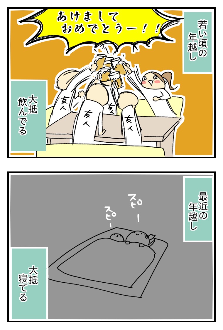 2018年01月06日 目がさめると、そこはお正月だった 寝て起きたらお正月になってる。ふっしぎー。いつか、チカが夜更かしできるようになったら若い頃の気持ちを思い出して、一緒に盛り上がりたいと思います。しかし、0時まで起きていられるか心配です。お母さん、22時過ぎると眠くなる。眠眠打破で乾杯してるかもしれない。※前回の記事で、“動揺”が“同様”になっているのをコメントで教えてもらったので訂正しました!ありがとうございます! ランキング参加しています。クリックで応援よろしくお願いします!育児絵日記ランキングへ 「チカ母」カテゴリの最新記事 < 前の記事次の記事 > コメント コメント一覧 (2) 1. さかなパパ 2018年01月06日 10:46 わかります!起きたら、不思議と正月ですよね♪今では、正月の雰囲気漂うショッピングモールを見て回るのが楽しみです♪箱根駅伝も感動しました!子供は、全く興味ありませんでしたけど♪遅くなりましたが、明けましておめでとうございます 2. まーりゃん 2018年01月06日 16:11 規則正しい生活で良いのではないかと(笑) 子供中心になりますものね ここ最近は夜中の一時や二時ってあったっけ…?みたいな コメントフォーム 名前 コメント 記事の評価 リセット リセット 顔 星 情報を記憶 コメントを投稿する