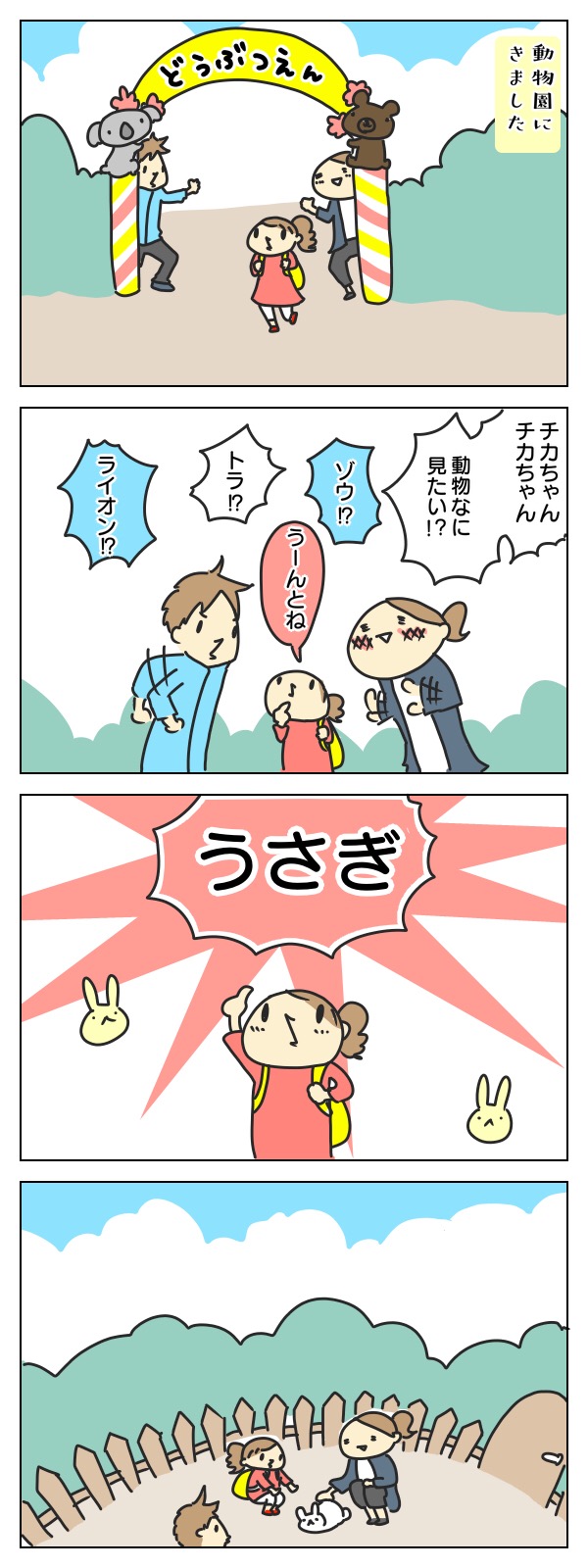 2018年09月25日 まさかの小動物チョイス 近所の公園にもいるよ!昨日行ったよ! 子どもの考えって柔軟というか大人は動物園にきたら大型の動物とか、動物園ならでは!なものに行きがちなのですがそれよりも何よりもうさぎでした。そういえば、うさぎって何でピンクで塗られることが多いのでしょうね?うさぎをピンクで塗った発案者は誰なのか。 こちらも是非!ランキング参加しています。クリックで応援よろしくお願いします!育児絵日記ランキングへ 「チカ・年少」カテゴリの最新記事 < 前の記事次の記事 > コメント コメント一覧 (3) 1. さかなパパ 2018年09月25日 17:15 私のいる県は、動物園が無いので羨ましいです!うちの子もうさぎが好きでペットショップに見に行くのですが、触るのは恐くてできないみたいです♪ たしかに、うさぎってピンクに塗りますよね!なんでなんですかね♪ 2. Leo 2018年09月25日 19:12 うちも近所にウサギやモルモットと触れ合える公園があります。 遠方の動物園に出かけた時、子どもがモルモットを触りたいと愚図って困りました。 まだお昼なのに、夕方受付分のチケットの長蛇の列に並ぶのが無理だったので、諦めてもらいました。 白いウサギの耳は透けてピンク色なので、全部ピンク色にしちゃったのかな?と思いました。 3. なおきんぐ 2018年09月25日 22:36 まさに似たような話が!うちの姪っ子@2歳半が今日関西からこちら北海道に来ています。事前に食べたい物リクエストを尋ねたら……ビスコ!まさかの北海道で食べたい物がビスコでした 笑 コメントフォーム 名前 コメント 記事の評価 リセット リセット 顔 星 情報を記憶 コメントを投稿する