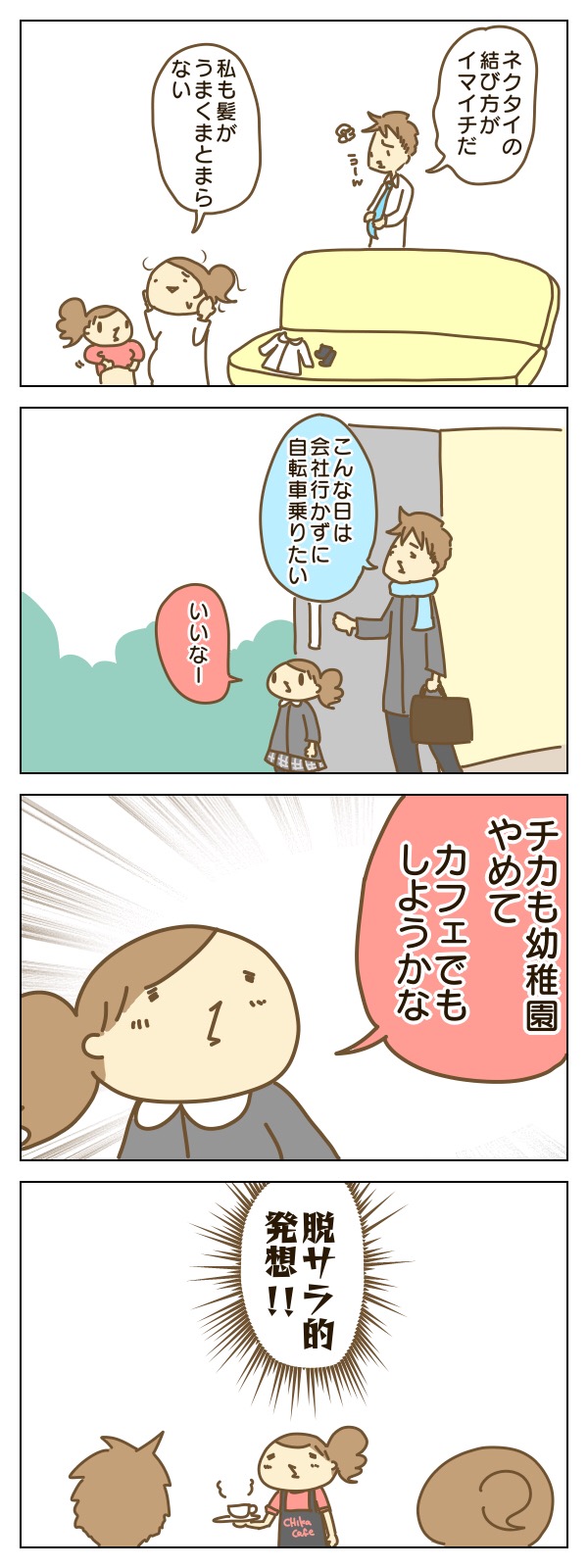 2019年01月25日 4歳にして脱サラ→開業思考 何でこの発想が出てきたのか謎だけど笑ったこんにちはチカ母です。気圧のせいとかバイオリズムとかで何かうまくいかないな〜って日ありますよね。夫も私も何となくシャッキリしない日だったのですがチカのお陰で笑顔になりました。よくよく聞いてたらカフェ開業ではなくて、一緒にお茶でもしようってことだったのですがどちらにしても朝から可愛い。 Instagramも是非!・チカ母のページ こちらも是非!ランキング参加しています。クリックで応援よろしくお願いします!育児絵日記ランキングへ 「チカ・年少」カテゴリの最新記事 < 前の記事次の記事 > コメント コメント一覧 (2) 1. ずんだもち子 2019年01月25日 10:31 カフェってのがまた可愛いわぁ❤️ 0 chika_mother がしました 2. 昼寝部 2019年01月25日 23:09 こんばんわ 娘さんの発想は大変ですが、良い発想ですね。 自ら立ち上げれば、ボスは自分ですからね。 0 chika_mother がしました コメントフォーム 名前 コメント 記事の評価 リセット リセット 顔 星 情報を記憶 コメントを投稿する