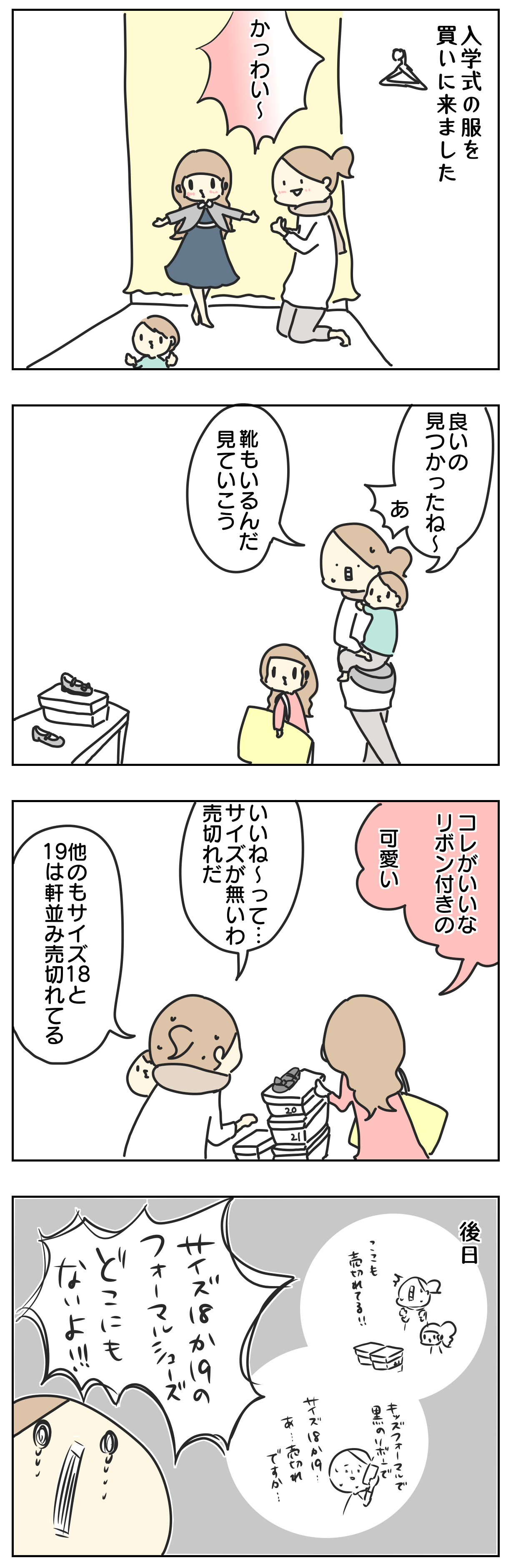 先日、自分の服を買いにショッピングモールに出掛けたのですが、子供服の扱いもある婦人服のお店でも入学式用の服を見ました!サイズとデザインはちゃんと見ていないので分かりませんがVisはフォーマル靴もあったと思います!