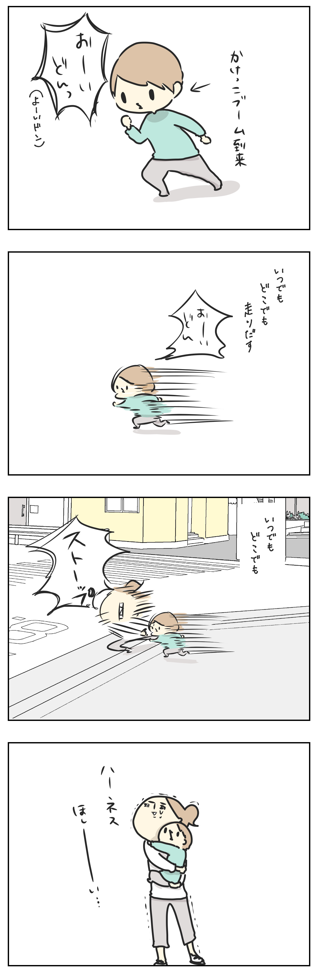 ハーネスは取り外し出来るもので、歩道を歩く時や電車利用の時は必須でした。