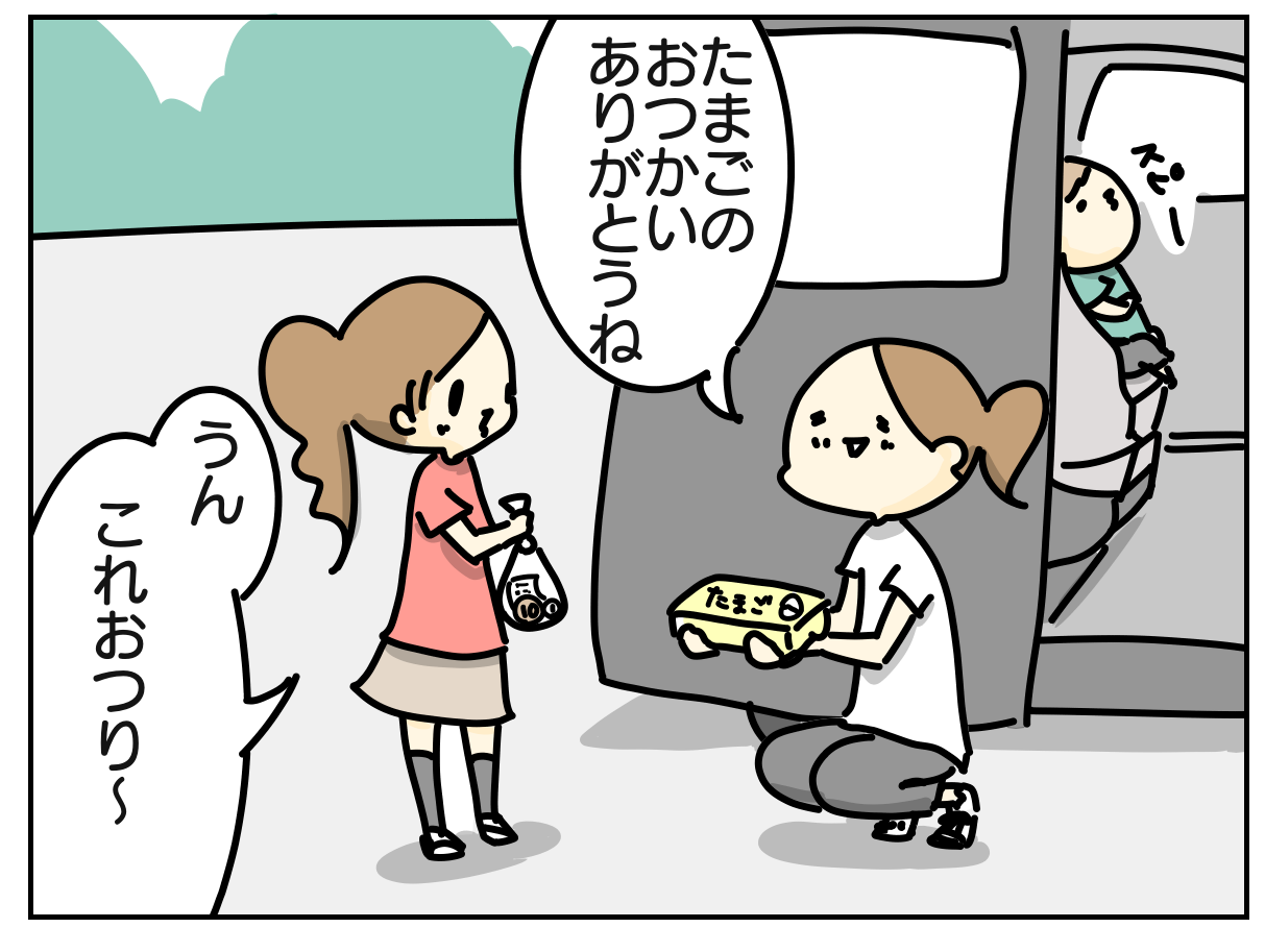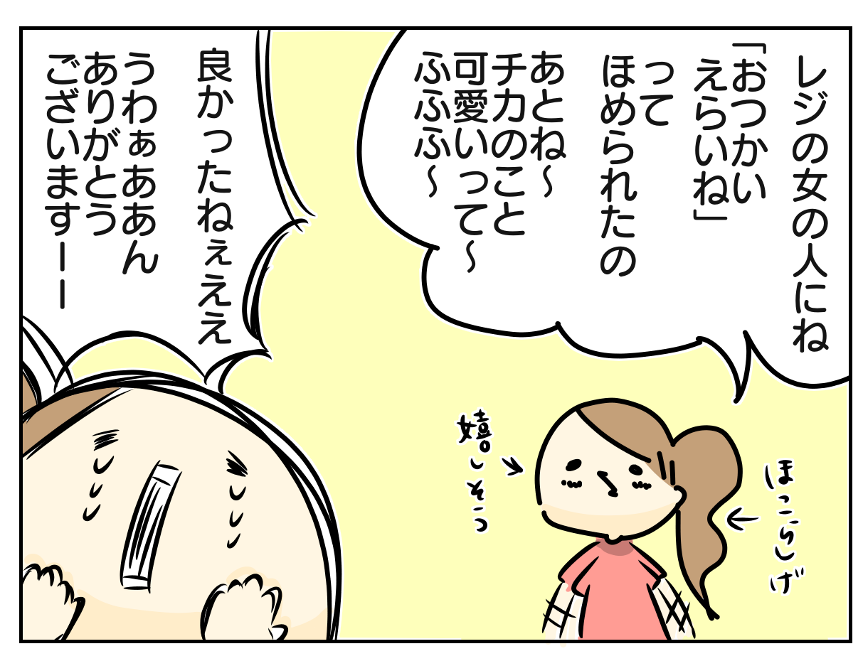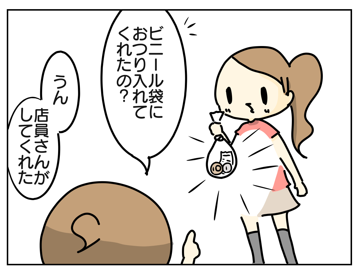 出てきた娘は笑顔で「お兄さんが偉いねって言ってくれておつりを袋に入れてくれたよ」と言って戻ってきました。若いのにしっかりされている方でその後も安心してお買い物を任せることができました。そうゆう対応を子供にしてもらえると嬉しいですよね。