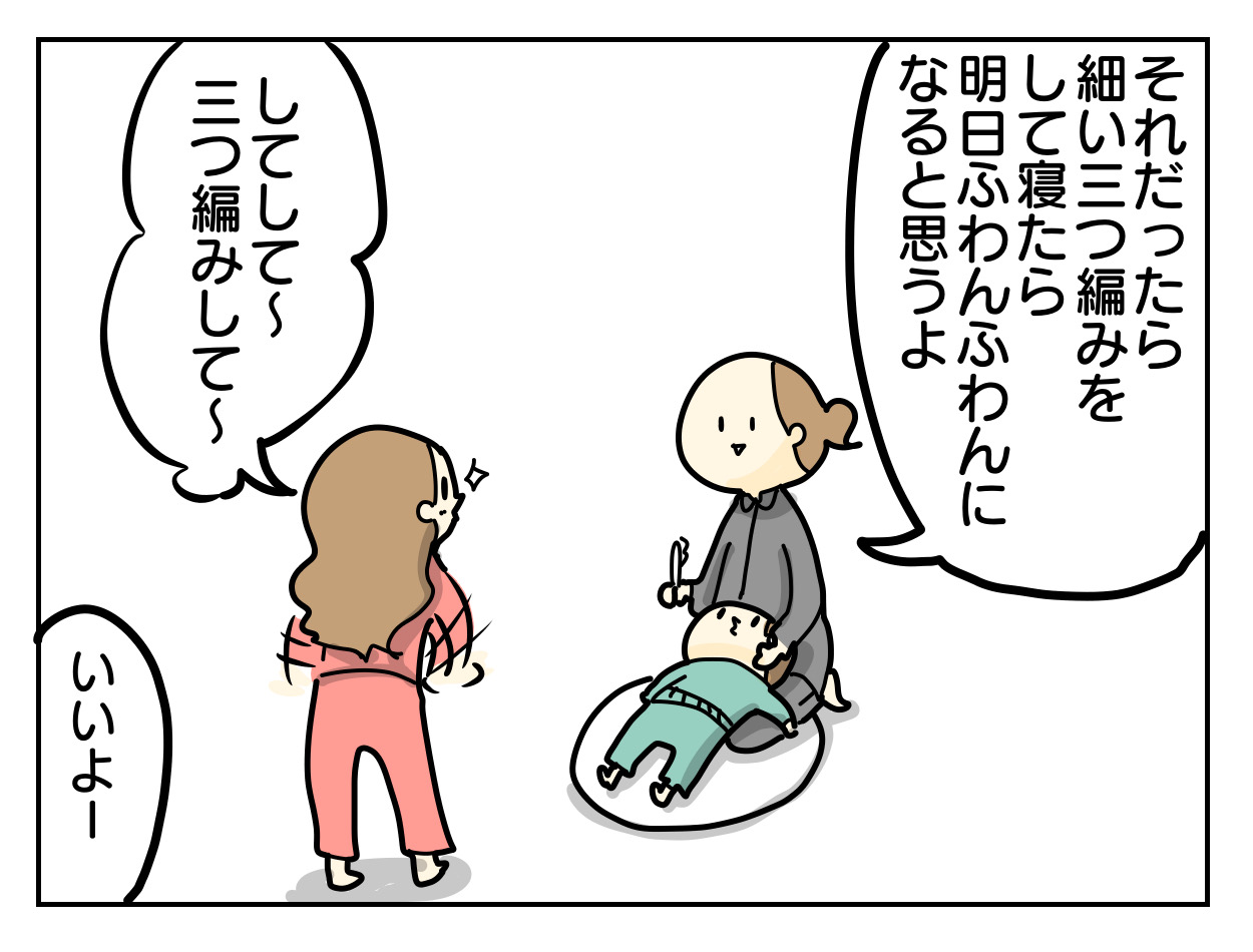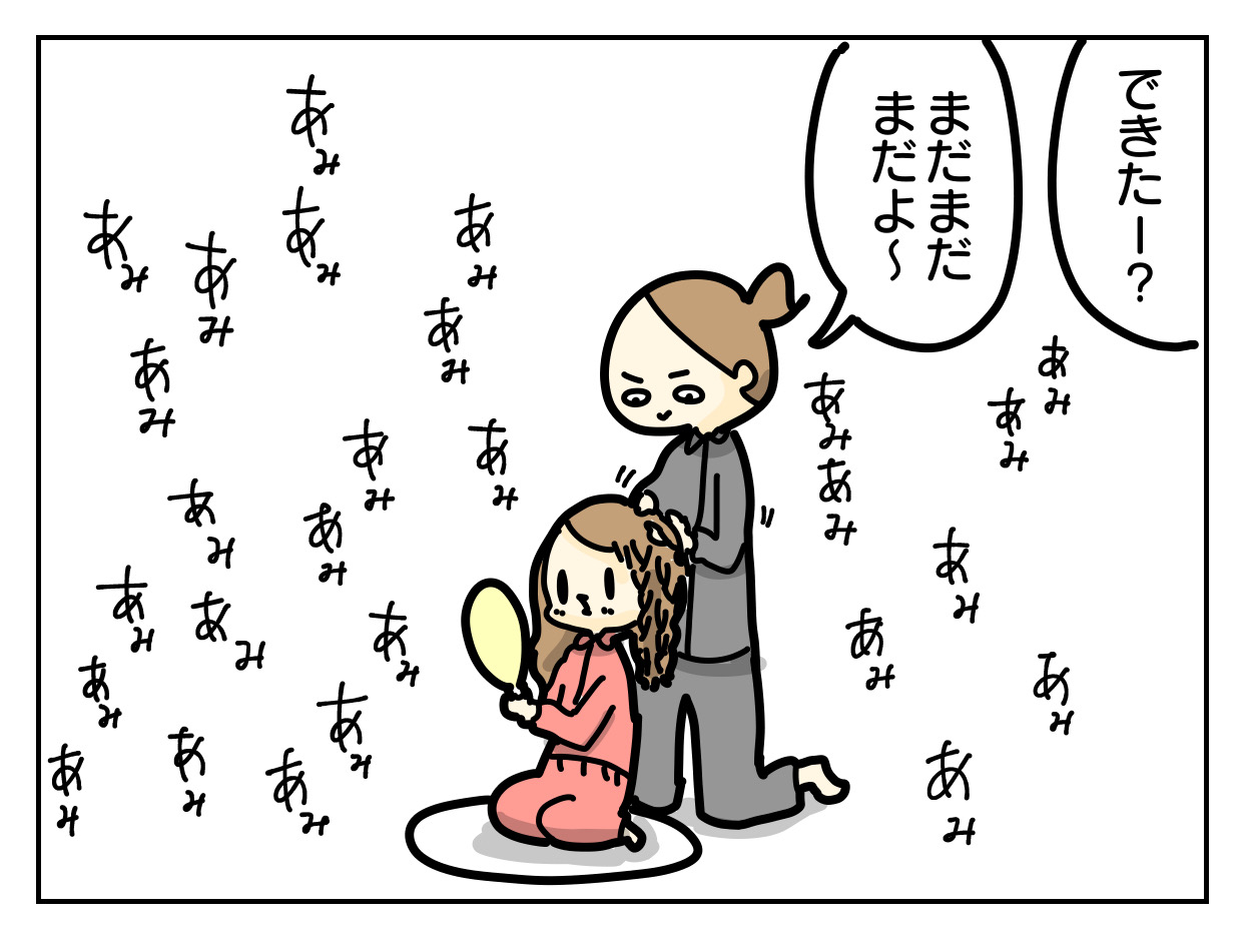 小学校でクラスの子がふわふわの髪にしてきてたとかで、チカも同じのにしたいとリクエストされたので気軽に引き受けたのですが、次回からはコテ使おうと思いましたわ。