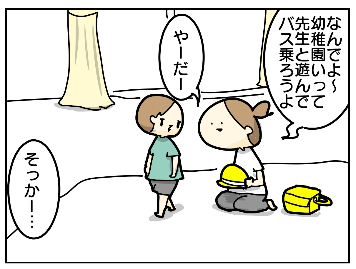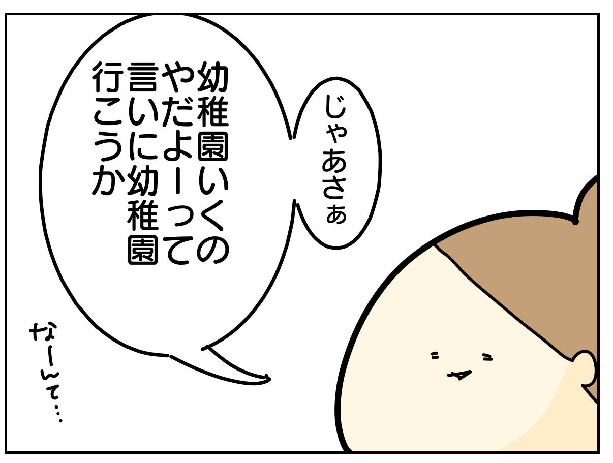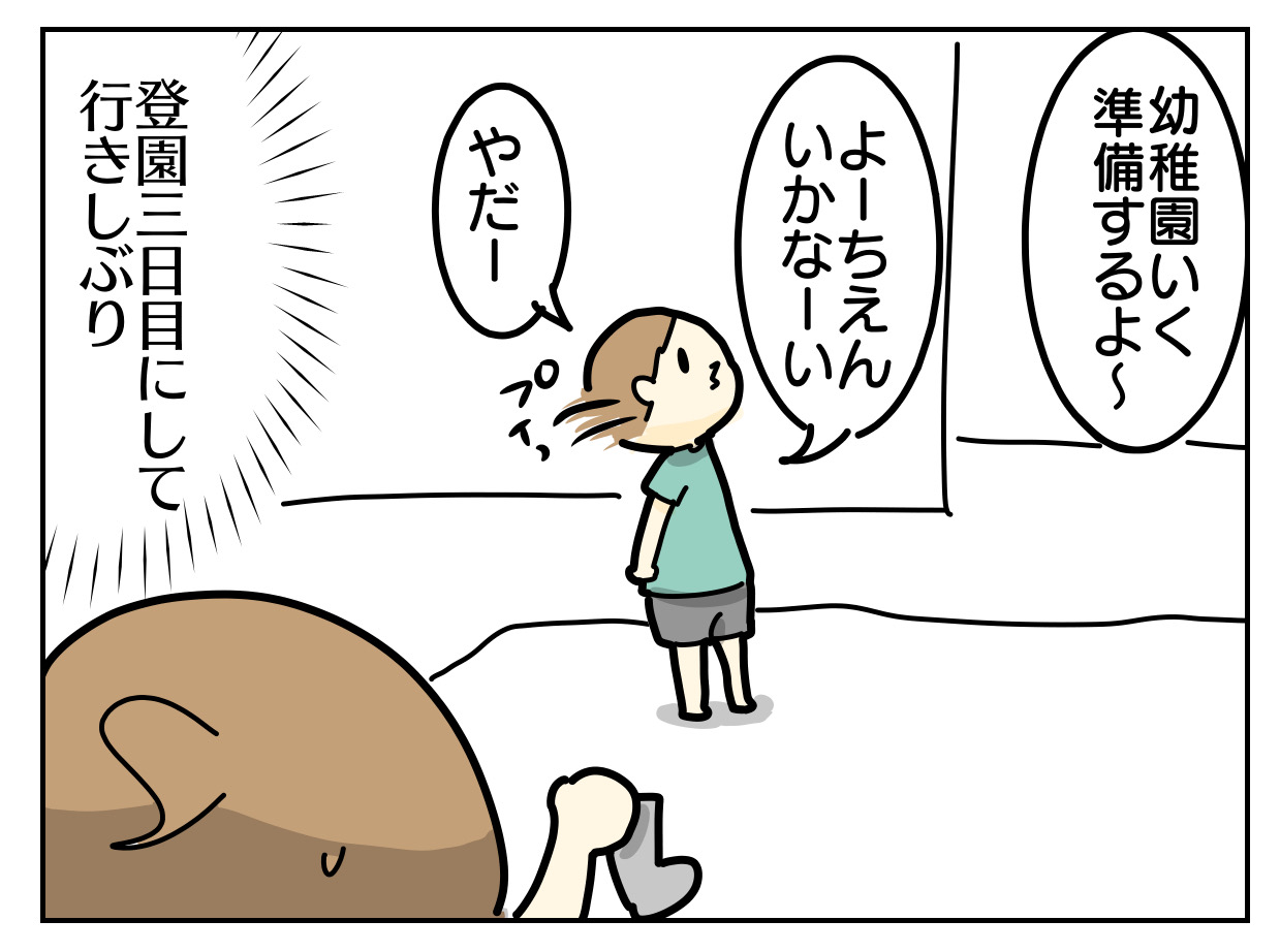 幼稚園に行きたくないというより、靴下履いたり帽子かぶったりの準備が嫌なご様子。