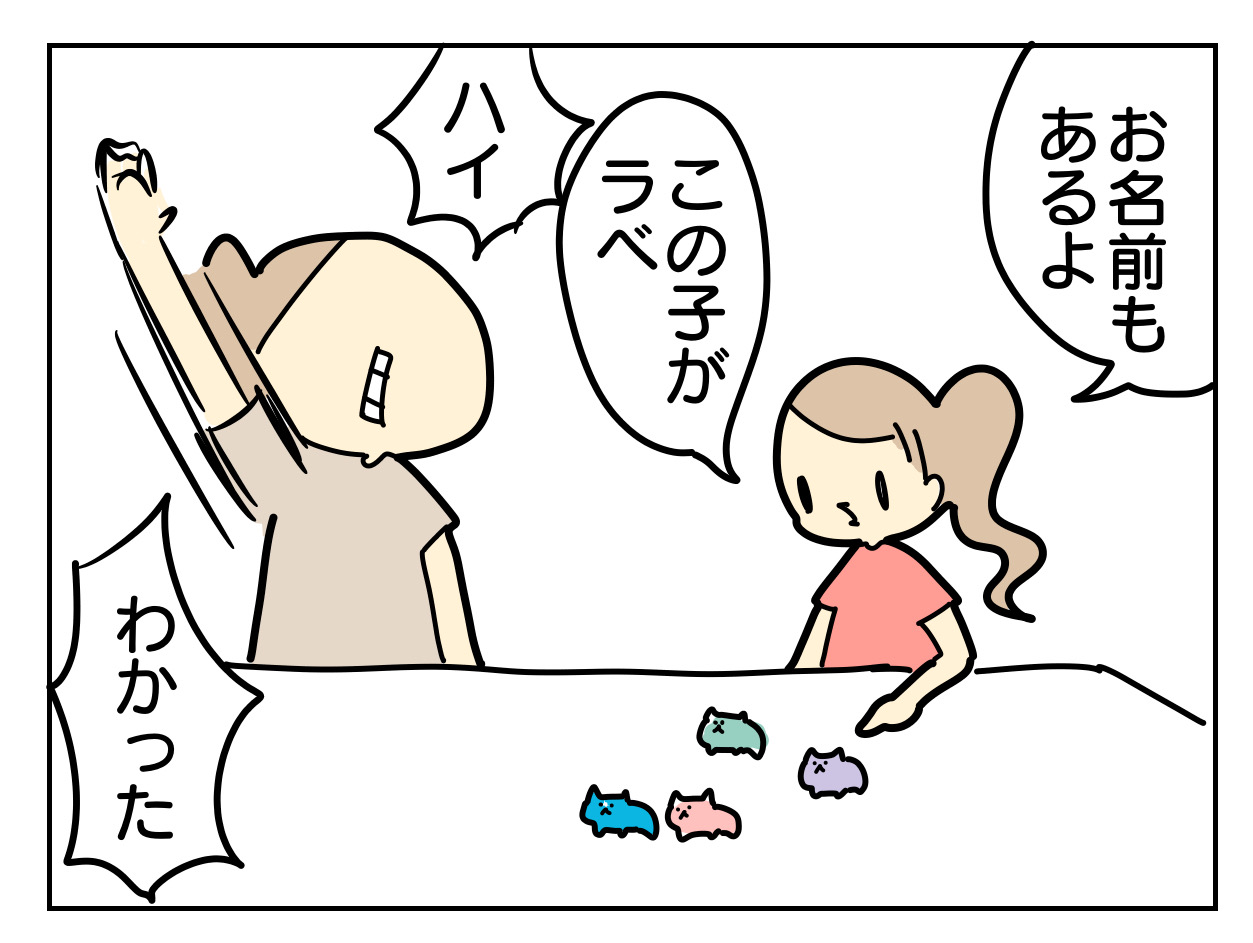 枕元にも豆夫とスミレとマサコという名のぬいぐるみが並んでいます。並び順も決めているんですが、チカちゃんは工作やお気に入りおもちゃの並べ方とか、こだわりありますか?