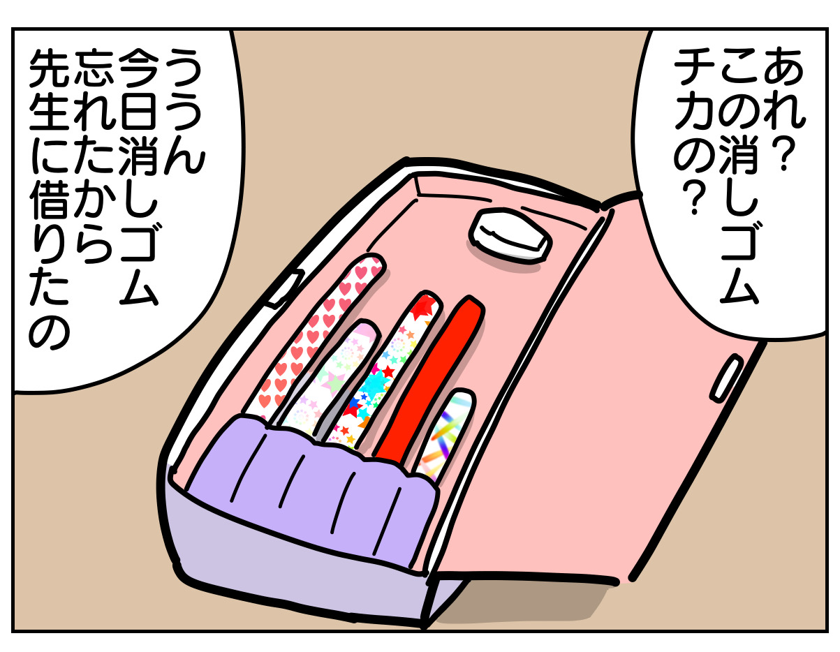 昨日宿題をしていたときに間違えて自分の机の文房具入れにしまってしまったらしく、学校で消しゴムが無いことに気づいて先生に借りたそうです。