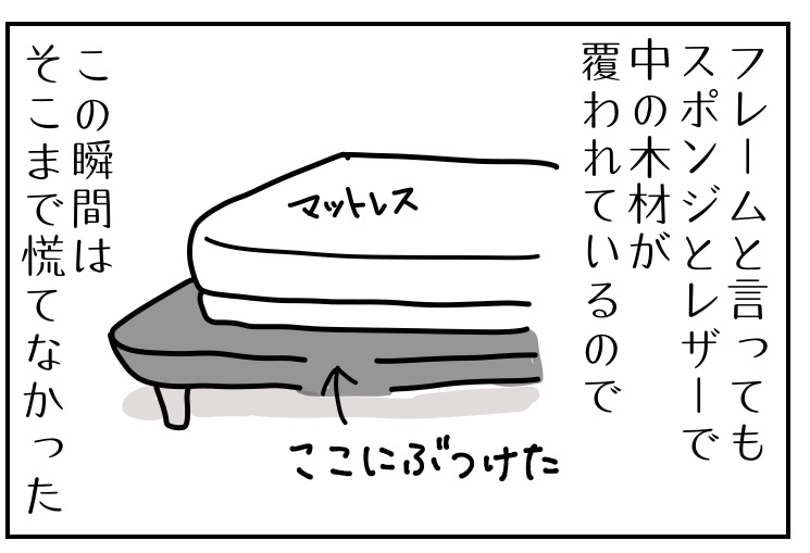 2コマでも書いているように、フレームは木材そのままではなくて、レザーとスポンジの中が木材なので角という角もなく、ぶつけた瞬間はこの後救急車を呼ぶことになるとは思ってもいませんでした。