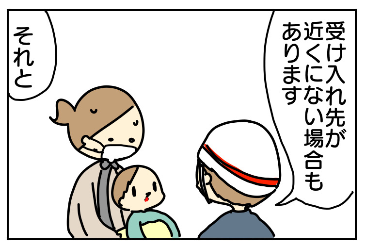 救急隊の方が病院を探してくれましたが、「1番近くて大きな病院だけど今日の当直は内科の先生(しかも行ったことがない病院)」か、「少し遠い(と言っても車なら30分もかからない所)けど、今日の当直の先生が小児科の先生」ならどちらがいいですか?と聞かれました。まだ1歳前だったので、迷わず小児科の先生がいる病院を選びました。(その先生には外来で何年もお世話になりました。)