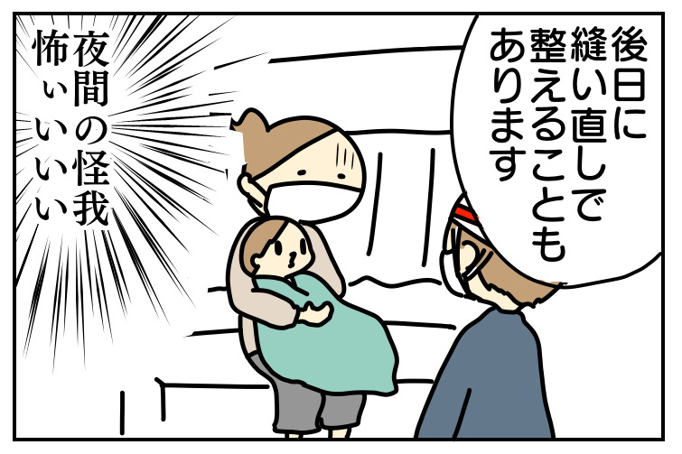 縫ってもらっても、綺麗に縫えるかはわからないので、整えるには縫い直してもらうことになるかもということを教えてもらい、夜間や休日に怪我するとこういうこともあるのかと学びました。