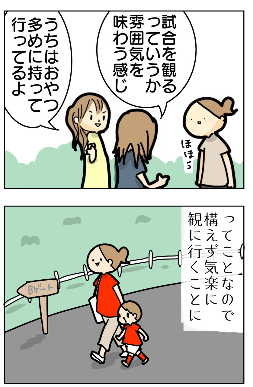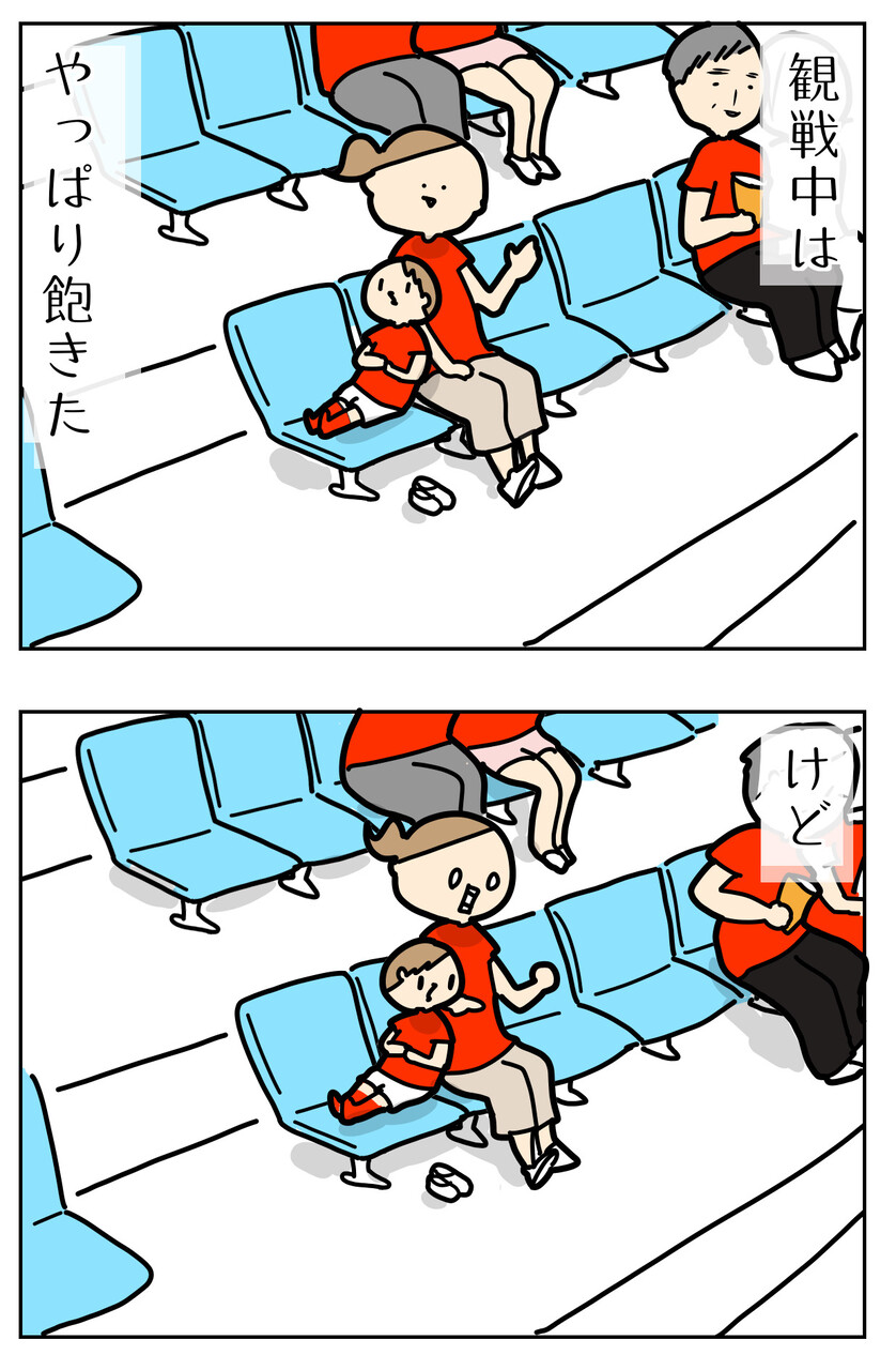 大人が楽しんでいると子供も徐々に染まってきますよね。まじめに試合見てるようには見えなかったけど、帰り道に「また応援に来たい、チームユニフォーム欲しい」と言って驚きました。