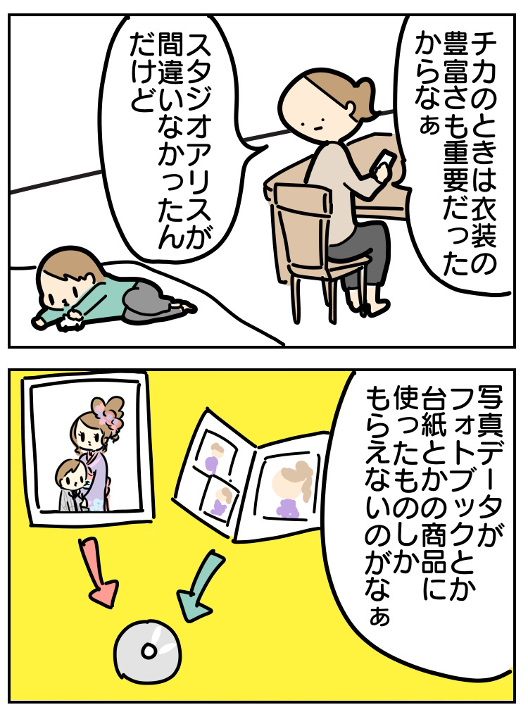 ただ、スタジオアリスさんだと写真のデータ化が、フォトアルバムなどの商品に使った写真のみなので、手元に残る画像は少なめ。