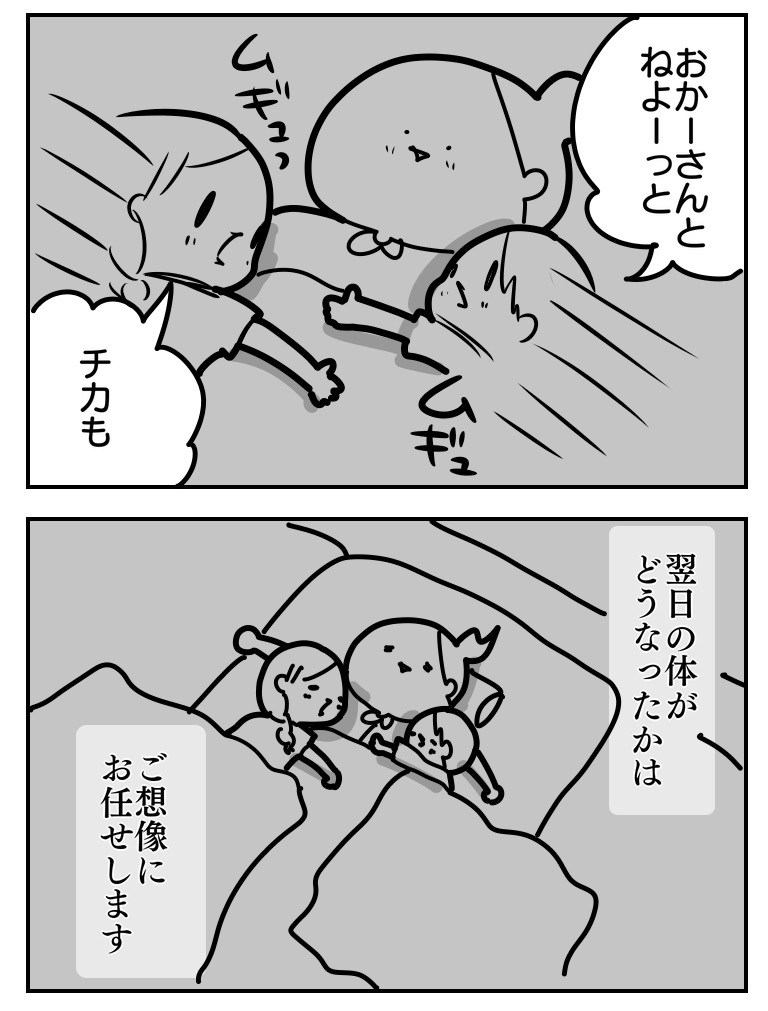 ヒナはまだしも、チカはもう一緒に寝るってことがなくなってきているので、まだ一緒に寝たいって思ってくれているのが嬉しいし可愛いしでもう。
