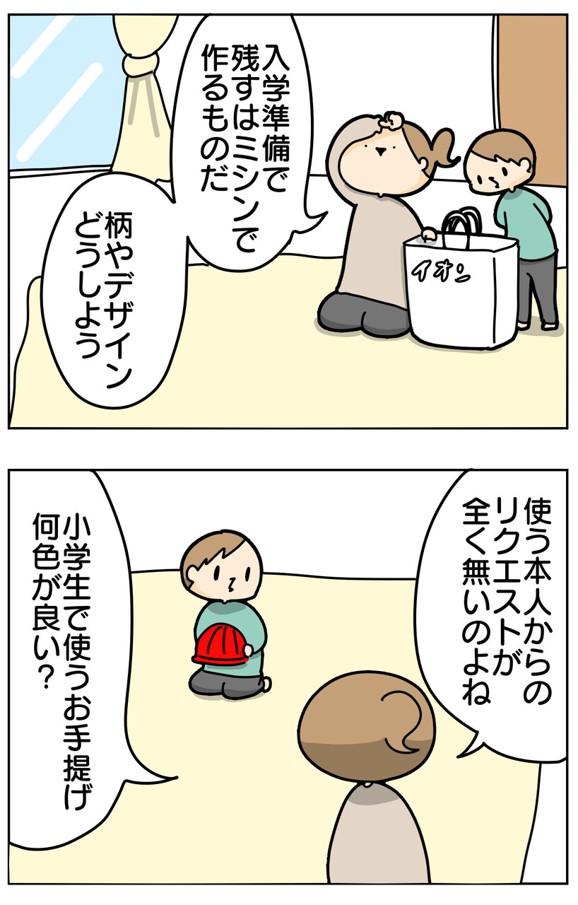 お手提げや上履き入れは「おかあさんにまかせる」とは言われていたのですが、色くらいは何か好みや希望があるかな〜と聞いてみたらこれですよ。