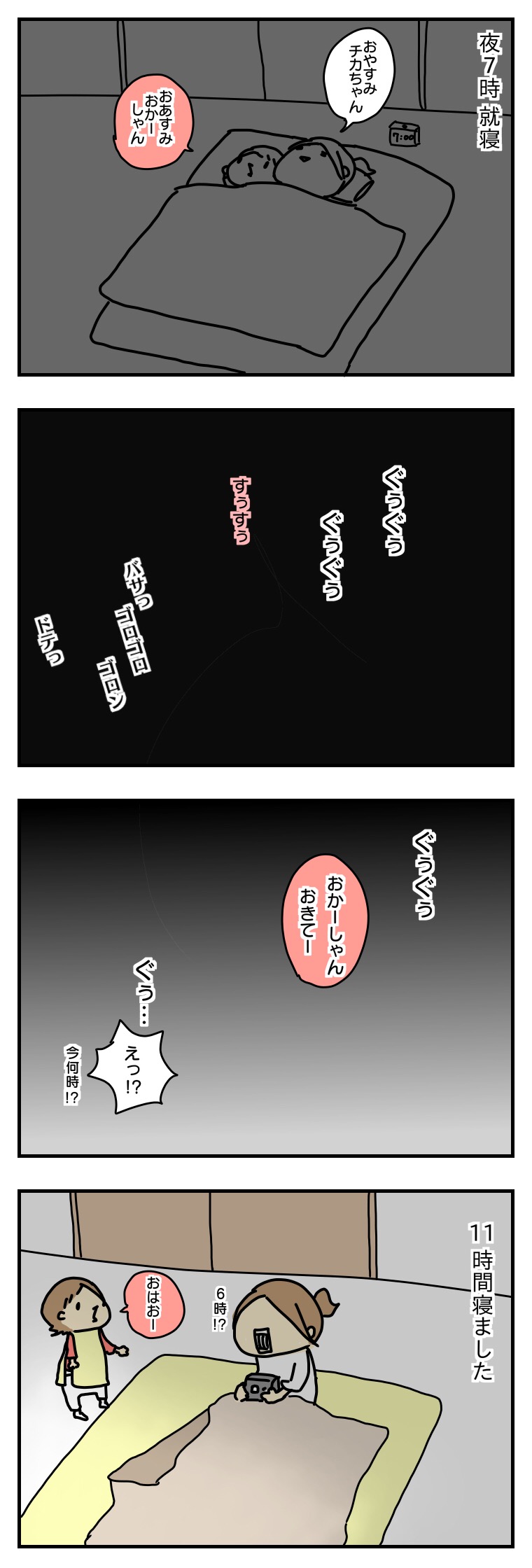 うちの場合はごはん食べてるか、終わって片付けてこれからお風呂だわーって時間で、なかなか早い時間にお布団に行けないのが悩みです。。。